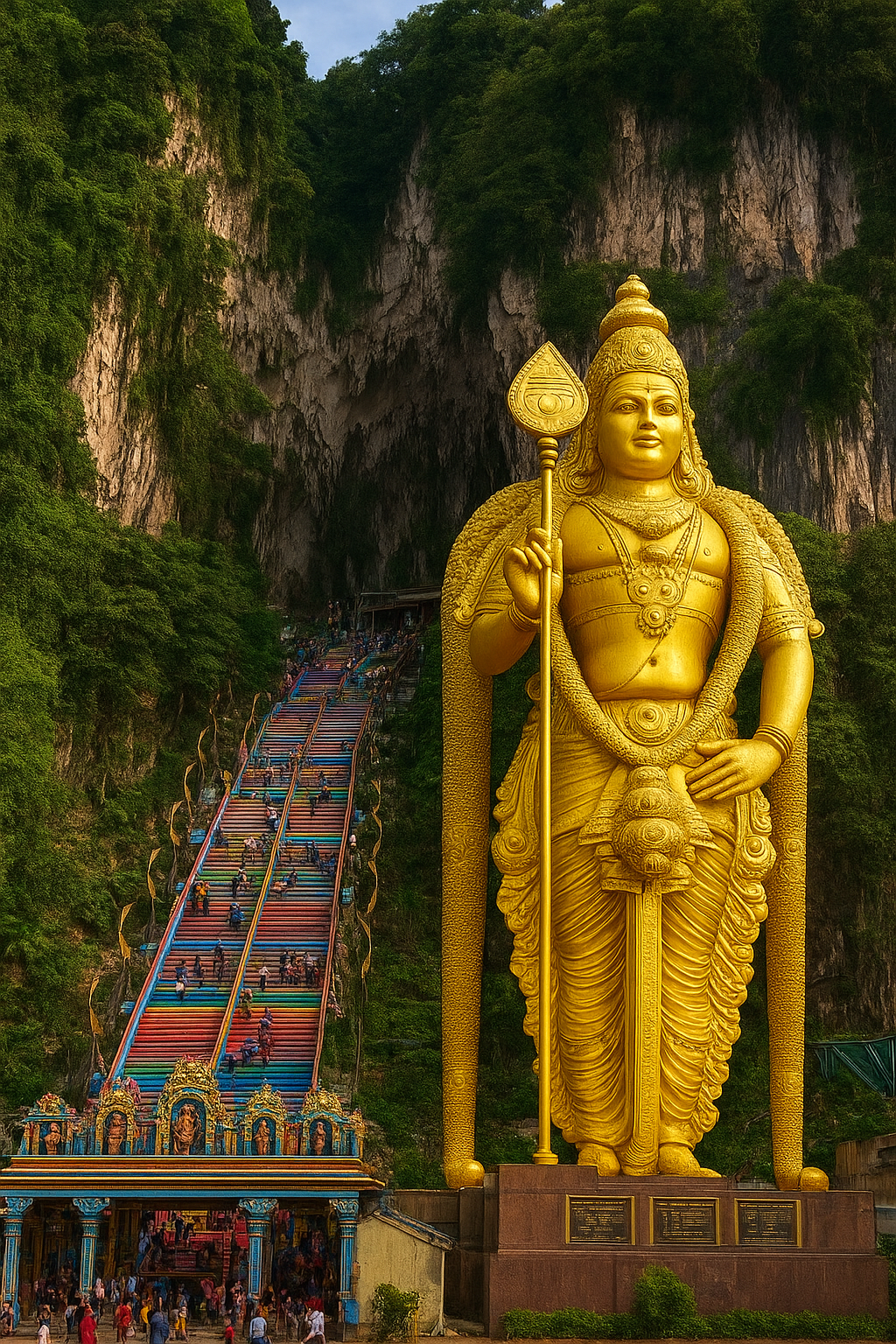 by a towering golden Murugan statue. It is both a spiritual site and a popular